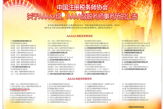 On January 14, 2015, the China Certified Tax Agents Association publishes name list of 4A/5A grade of tax agencies consisting of 12 tax agencies with 5A grade and 29 tax agencies with 4A grade.MOREMORE -