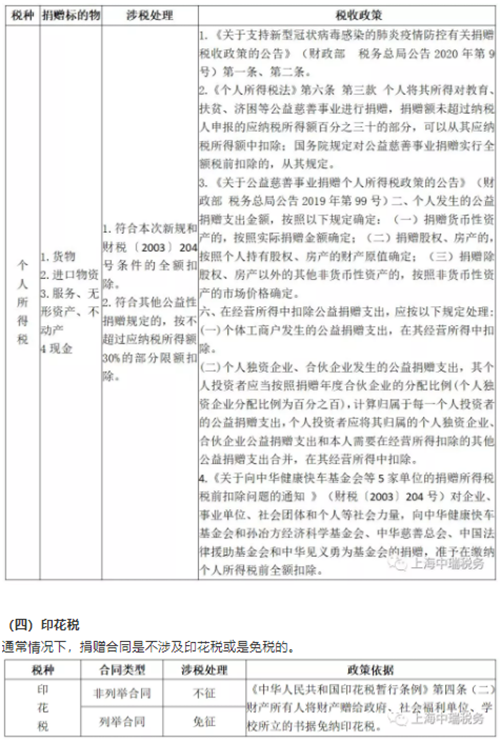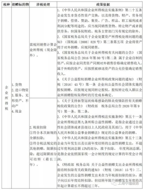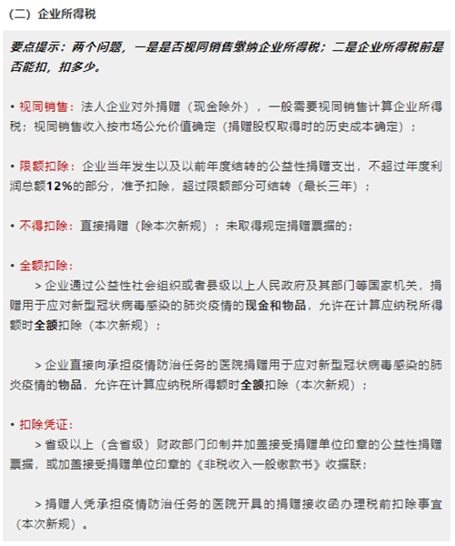 “一、企业和个人通过公益性社会组织或者县级以上人民政府及其部门等国家机关,捐赠用于应对新型冠状病毒感染的肺炎疫情的现金和物品,允许在计算应纳税所得额时全额扣除。”
