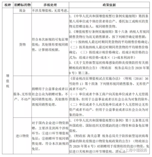 “三、单位和个体工商户将自产、委托加工或购买的货物,通过公益性社会组织和县级以上人民政府及其部门等国家机关,或者直接向承担疫情防治任务的医院,无偿捐赠用于应对新型冠状病毒感染的肺炎疫情的,免征增值税、消费税、城市维护建设税、教育费附加、地方教育附加。”