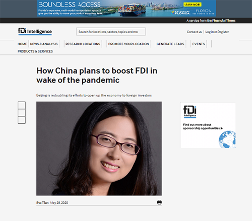 2020.5.28,中瑞税务集团上海办公室合伙人田雯燕发表的抗击新冠疫情文章《How China plans to boost FDI in wake of the pandemic》在英国FDI杂志刊登。(FDI杂志:《FDI》是为全球化业务而诞生的重要刊物,一本专业的招商权威杂志,双月刊发行,其15000册的发行量已为专业审核机构ABC所核实,是全球最专业的海外招商引资服务杂志。)