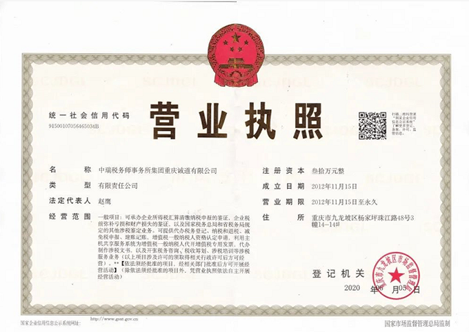 近期,中瑞税务集团重庆公司(全称:中瑞税务师事务所集团重庆诚道有限公司)已获得最新营业执照和执业证书,完成设立手续。