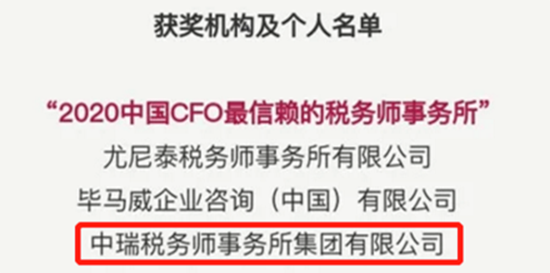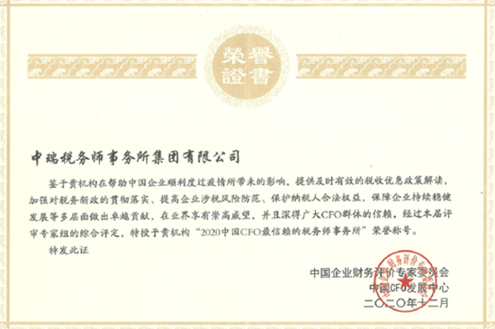 中瑞税务集团被中国企业财务评价专家委员会授予“2020中国CFO最信赖的税务师事务所”荣誉称号