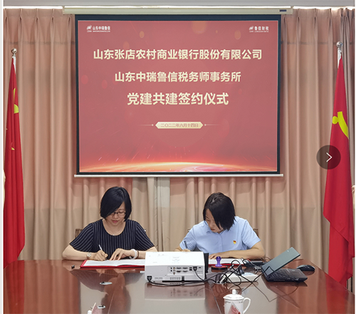 为加强党组织建设,激发党建新活力,更好地实现银企互利、共赢发展目标,2022年6月14日下午,中国共产党山东张店农村商业银行股份有限公司机关第四支部委员会与中共山东中瑞鲁信税务师事务所有限公司支部在鲁信公司二楼党建会议室举行了党建共建签约仪式,促进双方党建工作和业务经营深度合作。