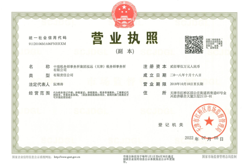 2022年07月8日,中瑞税务师事务所集团泓远(天津)税务师事务所有限公司已取得工商营业执照。