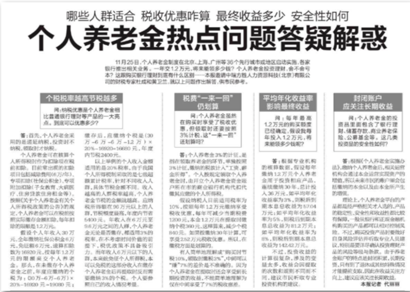 综上,个人养老金的税优问题不能一概而论,因人而异,由于个人养老金政策刚刚开始实施,我们相信随着时间的推移会日趋完善。