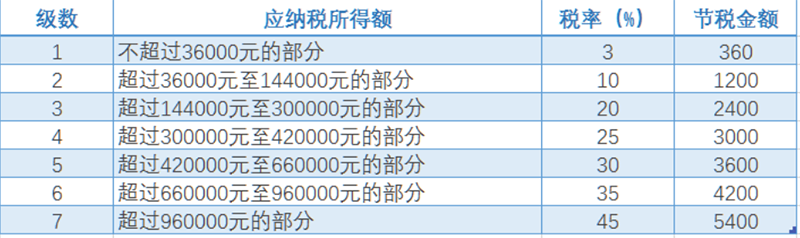 以上举例的个人收入金额适用的是20%税率,由于我国个人所得税制采取的是七级超额累计税率,针对不同收入人群,具体节税金额如下: