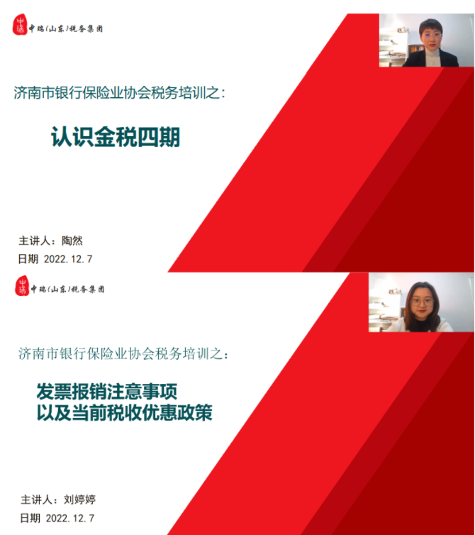 2022年12月7日上午,济南市银行保险业协会进行了“金税四期税务风险管控”专场培训,中瑞(山东)税务集团副总经理陶然、高级经理刘婷婷受邀为此次培训进行了授课。此次培训以线上直播的方式举行,协会会员116家银行保险机构及分支相关人员共计3600余人观看了直播课程。