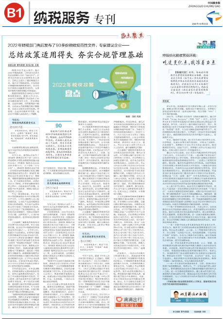 财税部门2022年发布的90多份税收规范性文件中,增值税、企业所得税和印花税,是纳税人最关注的三个税种。有关专家建议纳税人,及时盘点全年税收政策,准确把握国家政策导向,系统总结政策适用得失,以便为来年税务合规管理奠定坚实基础。