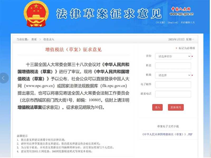 增值税法(草案)征求意见原文链接:http://www.npc.gov.cn/flcaw/userIndex.html?lid=ff808181842c261c018561423bfd00cf