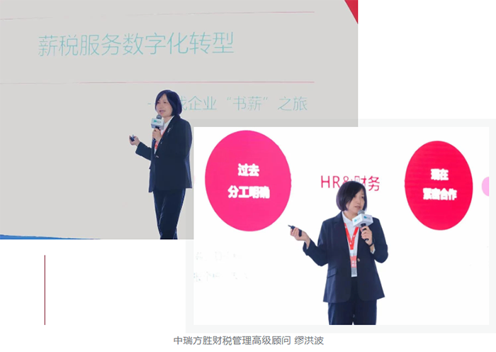 颁奖典礼同期还举办了“人力资源科技年度论坛”,中瑞方胜财税管理高级顾问缪洪波出席本次论坛,并分享了题为《薪税服务数字化转型》的主题演讲。缪洪波女士的主题演讲围绕如何有效通过数字化手段提升企业薪税管理效率进行了分析并给出了专业建议。