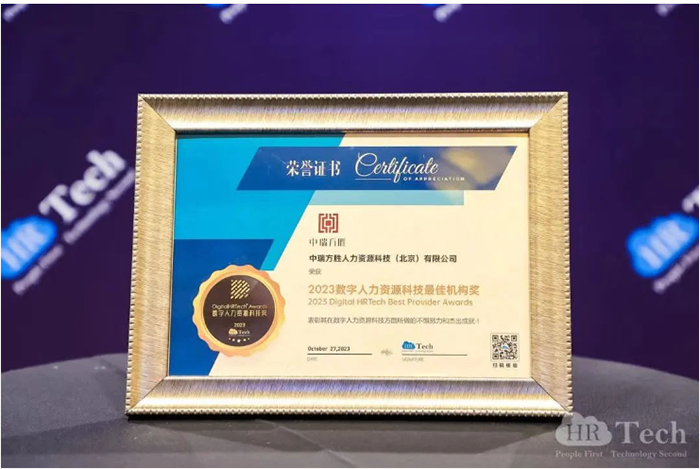 2023年10月27日,由中国领先的人力资源科技平台HRTechChina主办的2023人力资源科技年度论坛在北京隆重举行,中瑞方胜受邀参展并荣获“2023数字人力资源科技最佳机构奖”。