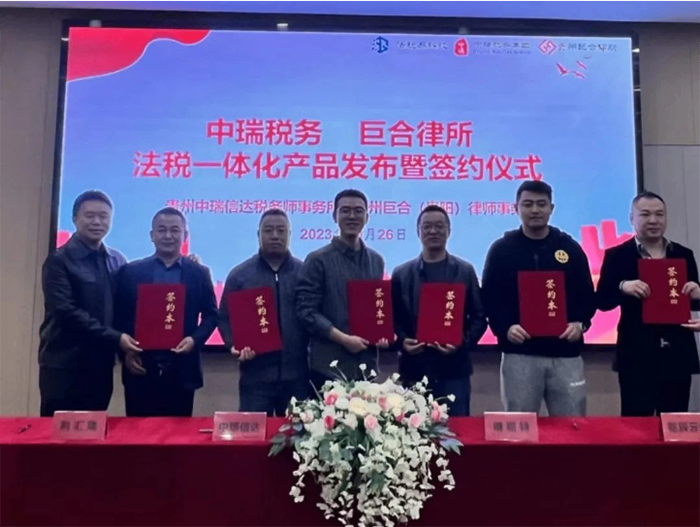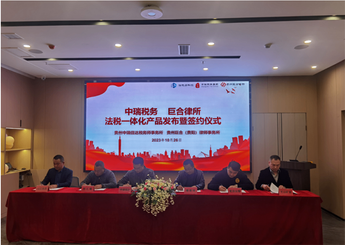 2023年10月26日上午,贵州中瑞信达税务师事务所、贵州巨合(贵阳)律师事务所正式举行法税一体化产品发布暨签约仪式。法财税一体化产品首批客户——贵州黔汇隆旅游发展有限公司等6家企业负责人与贵州中瑞信达税务师事务所有限公司合伙人、总经理蒋灵俊,贵州中瑞信达税务师事务所有限公司、贵州巨合律师事务所合伙人何振现场签订了合作协议。为解决中小民营企业融资难问题,还特别邀请银行人员出席了本次签约仪式。