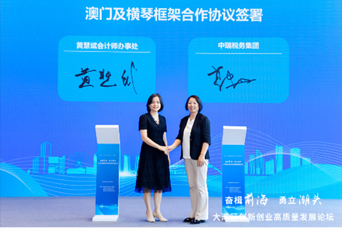 澳门黄慧斌执业会计师办事处持牌人、澳门税务学会理事长黄慧斌和中瑞税务师事务所集团有限公司所长郭丹丹在与会者的见证下正式签署澳门及横琴框架合作协议。双方共同在澳门设立税务咨询公司,这标志着中瑞税务集团正式开启了在大湾区的战略新起点。