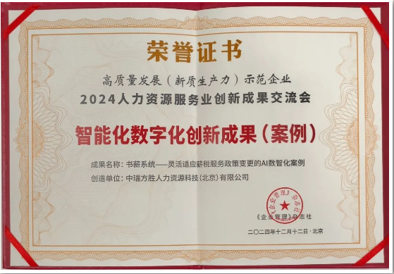 大会同期发布了“2024全国企业人力资源服务业成果(案例)” 众多创新案例在会上精彩亮相,展示了人力资源服务业在智能化、数字化、专业化等方面的卓越成就。不仅是对行业发展的全面总结,更是对未来趋势的深刻洞察与前瞻。经过层层筛选与严格评审,中瑞方胜《书薪系统-灵活适应薪税服务政策变更的AI数智化案例》成功入选“智能化数字化创新成果(案例)”。案例的入选不仅标志着中瑞方胜在数字化转型道路上迈出了坚实的一步,更是对我们创新能力和实践成果的高度认可。中瑞方胜通过深度整合人力资源管理理论与AI智能技术,凭借近20年薪税专业经验,研发出的书薪系统以其版块功能配置灵活,多载体,多场景应用等优势,紧跟薪税政策变化,既能满足企业精准算薪、复杂算薪的需求,又能确保企业数据的安全性与独立性,轻松实现企业财税的全流程管理。书薪系统不同税项,不同个税算法、与税局个税政策规则的统一性,均优于传统薪税平台,书薪系统拥有6项发明专利及10余项软件著作权。通过引入先进的信息技术和数据分析工具,重构了人事管理、绩效、薪酬等各个环节的管理流程,实现了人力资源管理的高效化、精准化和智能化。借助书薪系统数据智能服务,有效提升企业人效,更增强员工的满意度和归属感,为企业的发展注入了新的活力。中瑞方胜的智能化数字化创新实践,不仅是对自身业务模式与效率的全面升级,更是对行业未来发展路径的积极探索。我们相信,通过不断探索和实践人力资源管理数字化的新模式、新方法,将进一步推动企业在人才引领发展方面的创新和突破,为人力资源产业的高质量发展贡献专业力量。
