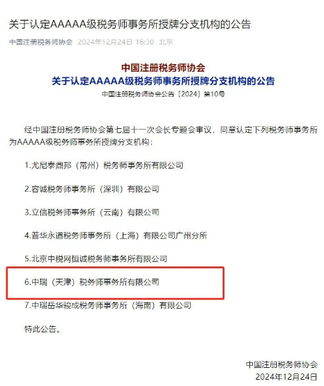 【荣誉】热烈祝贺中瑞(天津)税务师事务所被认定为AAAAA级税务师事务所授牌分支机构