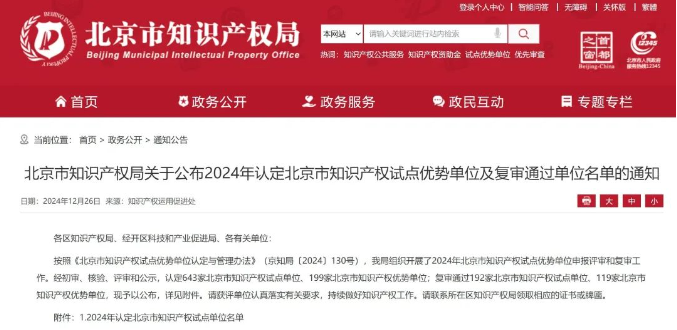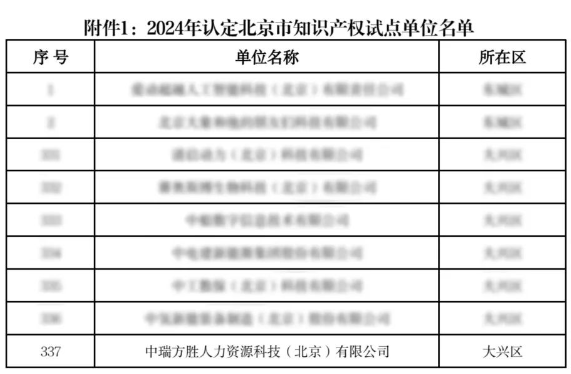 近日,北京市知识产权局公布了《北京市知识产权局关于公布2024年认定北京市知识产权试点优势单位及复审通过单位名单的通知》,中瑞方胜人力资源科技(北京)有限公司凭借在知识产权方面的创造、运用、保护以及完善的知识产权管理制度成功入选《2024年认定北京市知识产权试点单位名单》,成为试点单位是对中瑞方胜创新能力、知识产权意识、知识产权管理、核心专利积累的高度肯定。