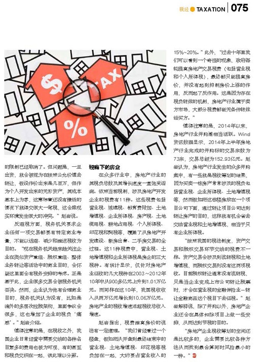 在第一期《新理财》企业“税痛”一文中,首批全国税务领军人才之一、中瑞国际集团中瑞税务师事务所副总经理赵岩,在采访中就税痛原因,税痛下的房企,深刻阐述了自己对企业“税痛”一话题的观点。下面是刊登在《新理财》中关于企业“税痛”的文章。