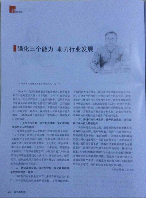 2015年第一期《注册税务师》杂志的“特别关注”栏目刊登了中税协宋兰会长的专访,中税协秘书长李林军和地方税协会长、秘书长等行业管理者的7篇文章,国内大型税务师事务所等行业执业者的5篇文章。其中,北京中瑞诚税务师事务所合伙人马宁老师提出,为助力行业发展,行业人要进一步强化三个能力: