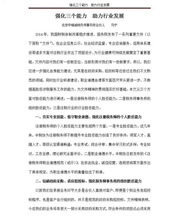2015年第一期《注册税务师》杂志刊登了北京中瑞诚税务师事务所合伙人马宁老师的文章
