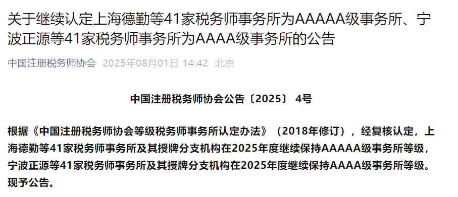 根据《中国注册税务师协会等级税务师事务所认定办法》(2018年修订),经复核认定,上海德勤等41家税务师事务所及其授牌分支机构在2025年度继续保持AAAAA级事务所等级,宁波正源等41家税务师事务所及其授牌分支机构在2025年度继续保持AAAA级事务所等级。现予公告。一、AAAAA级税务师事务所及其授牌分支机构......16.中瑞税务师事务所集团有限公司中瑞诚税务师事务所有限公司中瑞(山东)税务师事务所集团有限公司中瑞(天津)税务师事务所有限公司......特此公告。