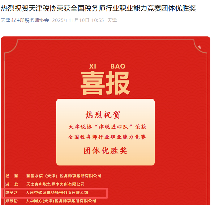 本次竞赛是全国税务师行业的高水平专业赛事,旨在提升从业人员的职业能力和综合素质。除代表天津市税协参加团体竞赛外,成宁芝还获得全国税务师行业职业能力竞赛个人组优胜奖,天津赛区二等奖,天津市注册税务师协会对获奖人员予以褒扬。