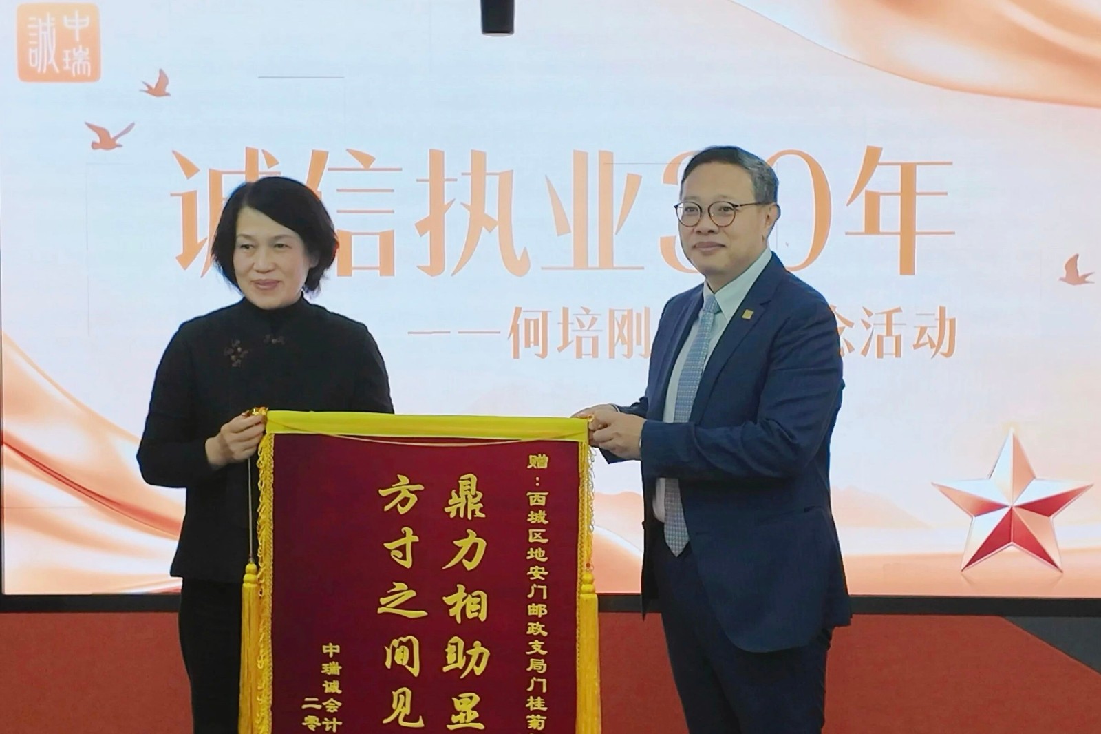 值此何培刚先生逝世一周年之际,为深切缅怀这位奠基者、传承其执业精神,中瑞诚在北京举办“诚信执业30年”何培刚先生纪念活动。活动特邀北京“两师”行业党委常务副书记、北京注协评协秘书长刘军,大信会计师事务所执行总裁孟晓萌,北京市政协委员、北京注册会计师协会副会长、北京匡正会计师事务所主任会计师陈力翃,全国五一劳动奖章获得者、全国劳动模范、北京市人大代表、西城区政协委员,北京市西城区地安门邮政支局局长门桂菊等出席,中瑞国际集团各板块领导、同仁及何老先生生前友好共50余人参加活动。活动由中瑞诚党支部书记余莉主持。