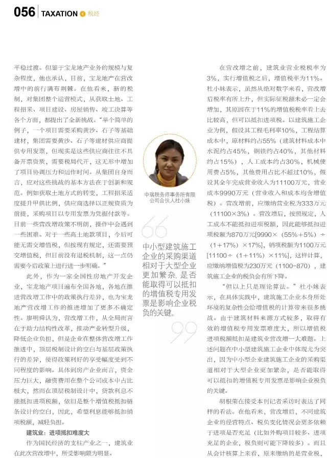此次专访报道中,杜小妹杜总就“房地产行业营改增效果及问题”情况发表了自己的观点。杜总表示,“对于房地产企业而言,可抵扣的进项税主要是:土地、房屋建筑成本(不包括人工)”。针对建筑施工企业面对税改出现的挑战,她直言“中小型建筑施工企业的采购渠道相对于大型企业更加繁杂,是否可以抵扣的增值税专用发票是影响企业税负的关键。”