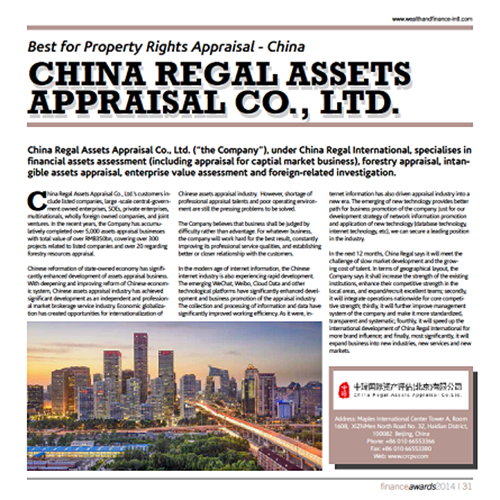 Wealth & Finance International is a famous global British Finance Information Platform and has lots of international readers. This platform hosts an award activity named “Finance Awards” each year. The award is used for commending global enterprises having best practice and financial innovation. China Regal International Assets Appraisal (Beijing) Limited obtains 2014 Finance Award at end of 2014 year because of its excellent practice and innovation in this year.