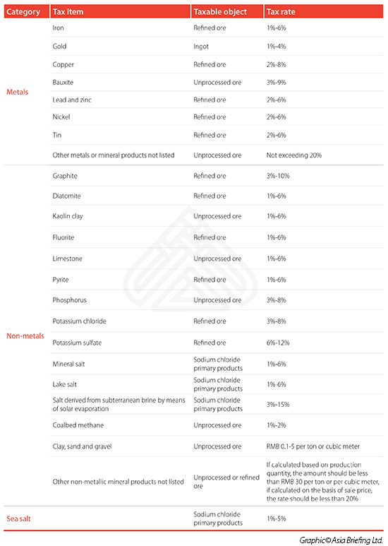 The following table details the tax rates for various metal and non-metal resources. For resources not included on the list, local governments can decide tax calculation and rates. The tax rates will remain the same for resources that are already included in the 2010 reform such as crude oil, natural gas, coal, rare earth, tungsten and molybdenum.